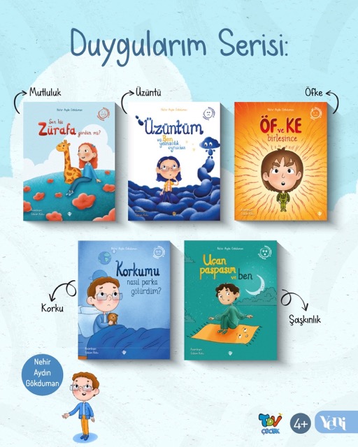“Üzüntüm ve Ben Yalnızcılık Oynarken”, “Sen Hiç Zürafa Gördün mü?”, “Uçan Paspasım ve Ben”, “Korkumu Nasıl Parka Götürdüm?” ve “Öf ve Ke Birleşince” adlı kitaplardan oluşan seri, her bir duyguyu ele alarak çocukların empati ve farkındalık becerilerini geliştirmeyi amaçlıyor.
