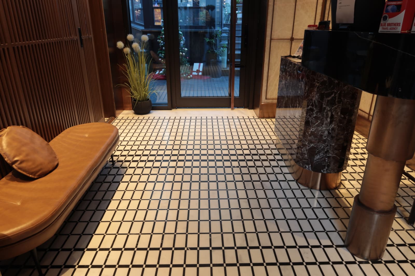 Dışarıdaki bu dingin atmosfer, lobi alanına adım atıldığında yerini seçkin bir kontrasta bırakıyor. Giriş alanında mimarın tercih ettiği zemin mozaikleri, mekana derinlik katan bir fon oluştururken, asıl odak noktası özel tasarım mobilya detaylarında toplanıyor. Lobinin merkezinde yer alan tasarım sehpa, Efesus Stone’un sağladığı Absolute Black ve Calacatta mermerlerinin cesur birlikteliğiyle hayat buluyor. Absolute Black’in ışığı emen mat ve güçlü karakteri, Calacatta’nın beyaz zemin üzerine yayılan dramatik damarlarıyla birleşerek mekanda heykelsi bir etki yaratıyor.